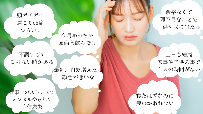 私自身もつらかった不調…。肩・頭こり、頭痛、腰痛、冷え、動悸、不眠、冷や汗、湿疹…